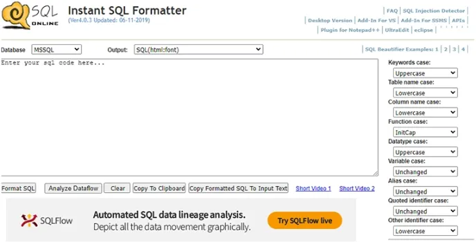 Instant SQL Formatter SQL syntax checker online platform is consists of various option buttons on the bottom line and right-hand side to navigate the database hassle-freely. They are format sql, analyze dataflow, copy to clipboard, copy formatted structure query language to input text, and many more.