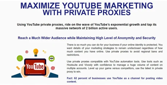 Instantproxies is a reputed platform that offers a high-security youtube proxy for marketing. The proxy maintains a high level of anonymity for the users. Hence, they are happy and satisfied with the features of the same.