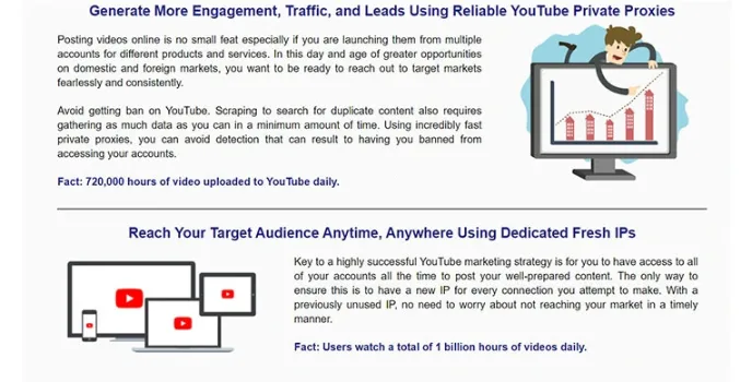 Instantproxies Youtube proxy is a reliable tool that can generate traffic for the websites resulting in engagement. It can scrap duplicate content easily. The advanced control panel can easily conceal the online status of the users. The platform is widespread, and the company's experts are always ready to answer the queries of the users around the clock.