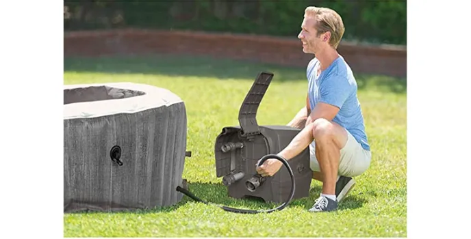 Intex 28439E is a popular outdoor spa tub that has attracted varied customer reviews. The product is enriched with state of the art features that make it ideal for the users who want to experience spa-like enjoyment at their doorstep. Intex 28439e grey wood deluxe 4 people inflatable spa hot tub has a set of wireless touch control panels and allows the users to fill the tub till the top to get an unforgettable experience. There are around 140 powerful jets to provide the best massage to the body and feel completely relaxed. It has been rated as the best inflatable hot tub in the related field.