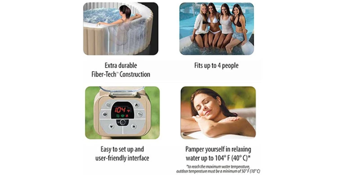 Intex pure spa plus can fill the water within 20 minutes and the users are set to dip in it. The high-powered water jet will throw the water at high speed and the users will feel relaxed and pampered. Intex pure spa 4 people can easily accommodate 4 people and hence is one of the best inflatable hot tubs for winter too. And other Products which offer similar features of this tub are Intex 4 Person Hot Tub and Intex PureSpa Bubble Massage.