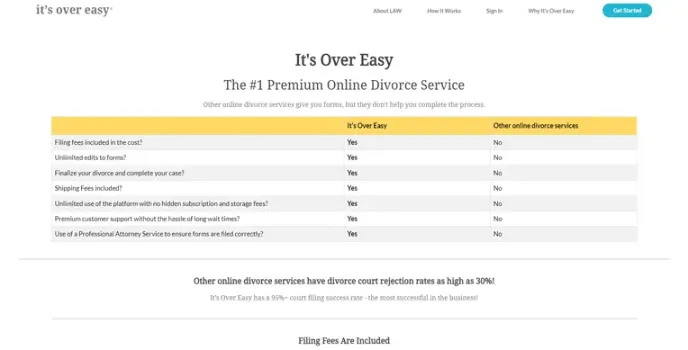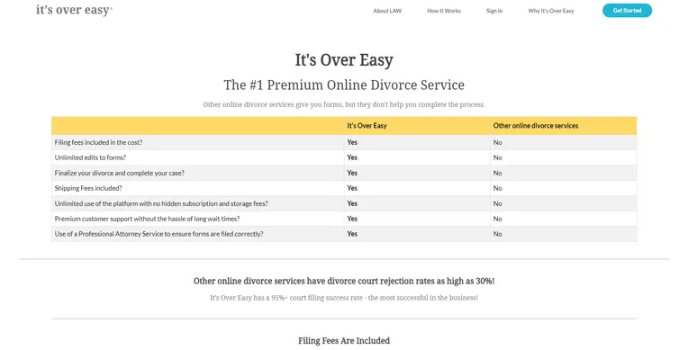 It also offers additional features like spouse service by mail, QDRO tools for retirement accounts, virtual parenting classes, and a comprehensive name change notification kit. Itβs Over Easy is the online divorce service to file uncontested divorce as it is less time-consuming, cheaper, and keeps your privacy during the process. It helps to resolve issues like child custody and division of assets through the platform.