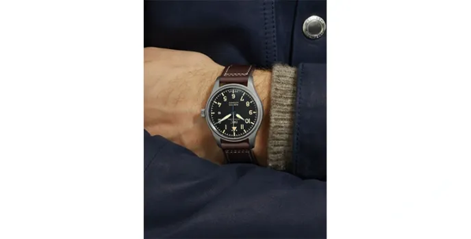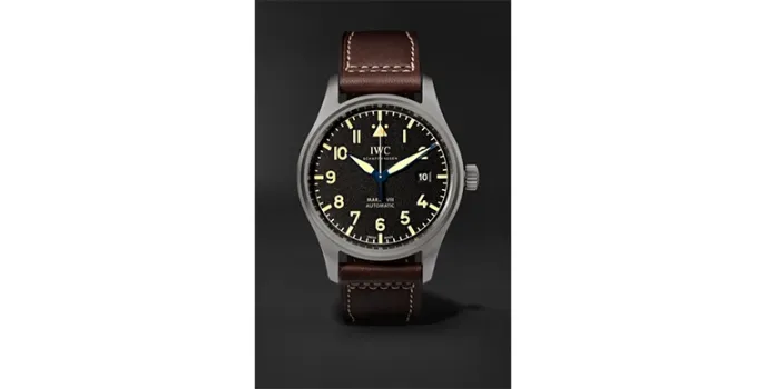 If you seek a classy yet simple designed Aviator Watch, check out the IWC Schaffhausen Pilot’s Mark XVIII Heritage with a matte black dial with beige luminescent Arabic numerals, hands, and indices.