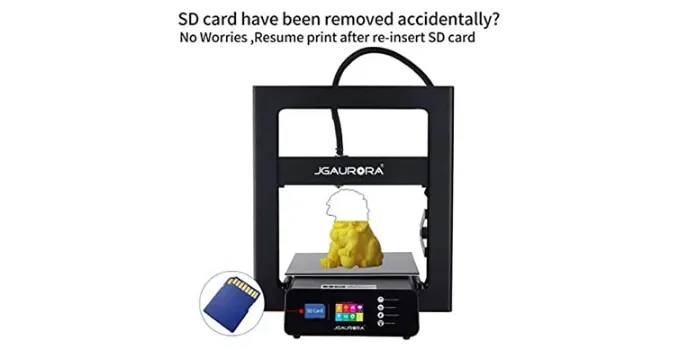 The best thing about this JGMaker cheap 3D Printer is that it has an SD card hot plugin giving you an option to insert the SD card, which you continue printing and remove when not in printing. It also gives stability with its sturdy metal base in its side element by providing a well-distributed printing process without any disturbance.
