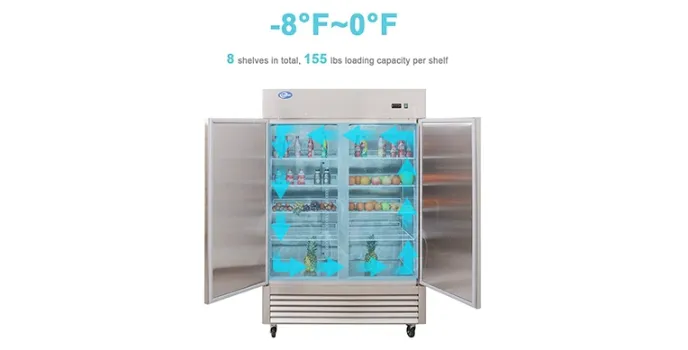 Kalifon Reach-in is the best 2 Door Stainless Steel Freezer with enhanced LED lighting and LCD for temperature adjustments. It allows temperatures from 8 degrees to 0 degrees F and From -22.2 C to -17.7 degrees C.