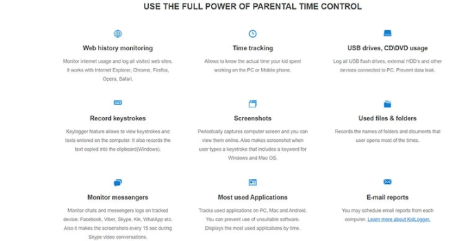 Web history monitor checks all logins, Record keystrokes maintain all records of typed keys, and screenshot tool captured all computer or mobile screens periodically. It also maintains time tracks and usage of cd/DVD/ USB drives. The final browsing data will be sent to parents based on scheduled emails selected by parents.