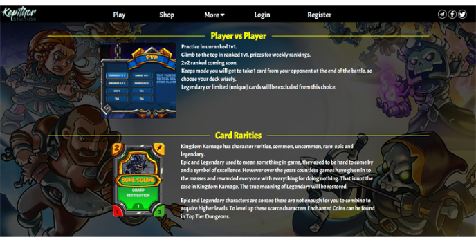Kingdom Karnage is a free-to-play NFT Card Game with blockchain products and an economy based on Enjin Coin. Build a deck of 30 cards and go on a quest to conquer campaign modes for each faction, uncover and explore dungeons for rewards, and bask in the glory of PvP victories. Manage your health, attack, movement, and skills with the extra difficulty of countdown timers in turn-based combat.