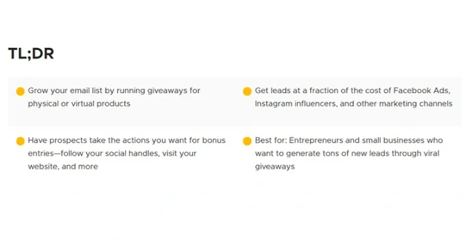 The viral marketing platform is best for entrepreneurs and small businesses that want to generate tons of new leads through viral and effective giveaways for physical or virtual products.