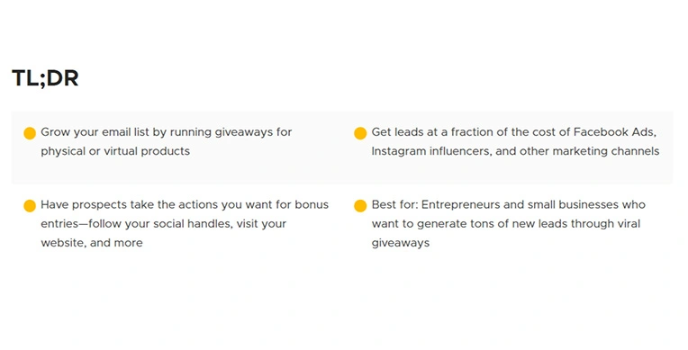 The viral marketing platform is best for entrepreneurs and small businesses that want to generate tons of new leads through viral and effective giveaways for physical or virtual products.