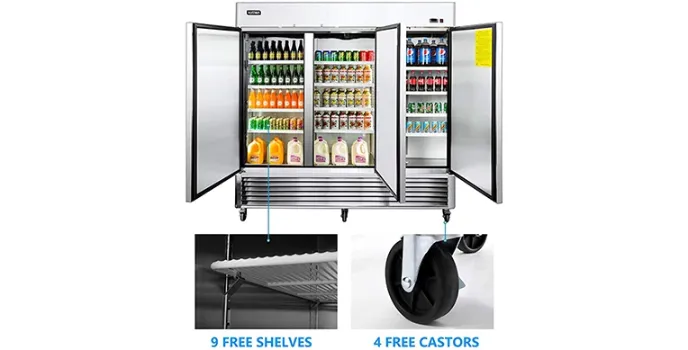 This three-door commercial freezer device is famous for its ability to save energy by a whopping amount of 40% due to its self-closing feature. Freezer's electricity consumption costs you no money as it consumes no less or more energy in keeping the fridge open while unloading and loading food, but after loading the items, one can close to all keep them secure and fresh for a long time by using the lock and key feature.