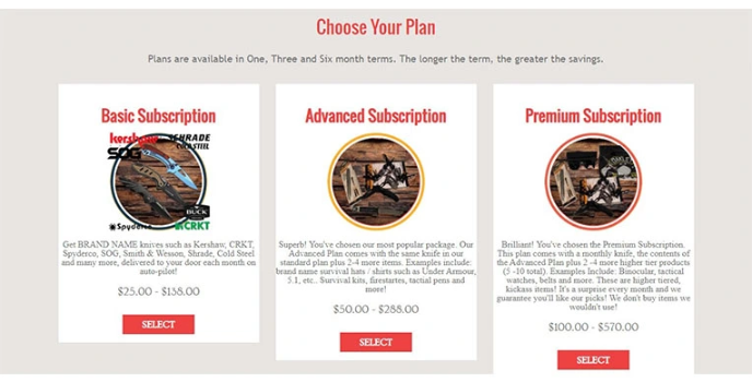 KnifeSubscription.Club provides the greatest survival knife box subscription plan with premium products. The plan comes with all the items in the premium plan plus 2-4 more high-end, top-tier, kickass items. This includes additional, higher-end knives, multi-tools, premium survival kits, bags, and EDC gear. The advanced plan comes with the same knife in the standard plan plus 2-4 more items.