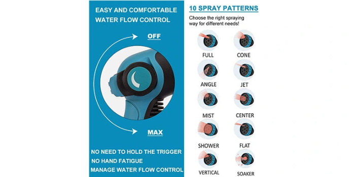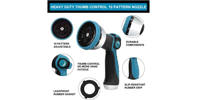 The Knoikos Garden Hose is upgraded and comes with a high-density double-layer latex core with a rugged 3750D polyester outer cover. It is quite powerful and can handle immense water pressure ranging from 3-12 BAR, making it suitable for long-term usage. Unlike the Teknor Apex Garden hose, the product features ten nozzle patterns and offers different designs for varying needs. The rubber handle is super soft, enabling the sprayer to be used comfortably and prevents slipping.