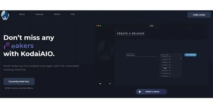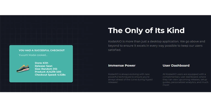 Kodai is an automation tool. It manipulates the process of buying limited edition sneakers that are high on demand; they do it by consuming the API of the sites it supports, in this case, platforms like Shopify, supremes, Adidas, Yeezy supplies, and more. The Kodai AIO bot works by interacting with it; you give the bot a command which can be done in the user interface to give the commands. This features among the best Shopify bots in the market, similar to the Shopify Themes.