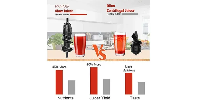 This KOIOS slow masticating juicer produces less sound of 60dB, and this feature is not available in Kuving's slow juicer. Users also get the feature auger squeezing and reverse function, ensuring that the slow juicer can efficiently juice everything. And the reverse function enables the users to control the direction in two motions, i.e., normal and reverse motion. This also prevents clogging inside the slow juicer. The reverse motion feature is not available in some of the premium slow juicers like the Tribest slow juicer.