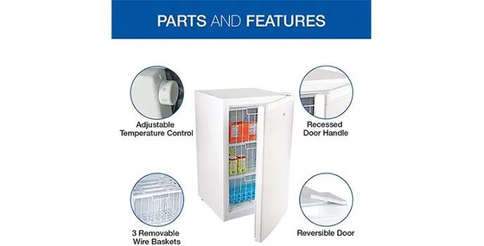 The compact and sleek appearance of the Koolatron freezer makes it ideal for the products. The adjustable legs and the three removable wire baskets help easily organize the food items.