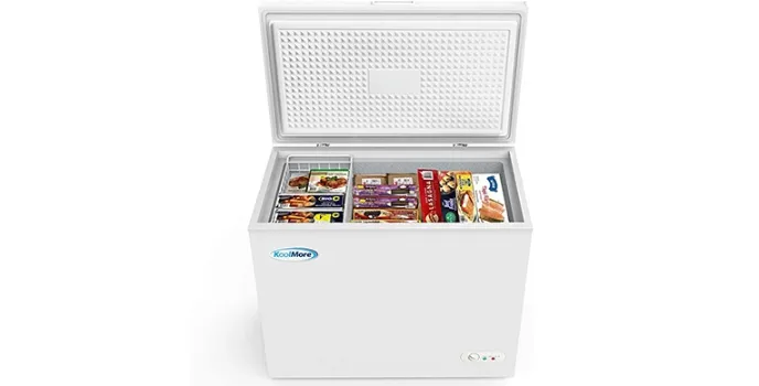 KoolMore fridge is one of the top-performing and energy-efficient freezers as it utilizes a 1/5 hp compressor and R600a refrigerant, which is environmentally friendly due to its less power consumption. It effortlessly maintains a temperature in the range between 1 to -8 degrees Fahrenheit.