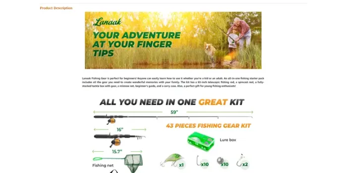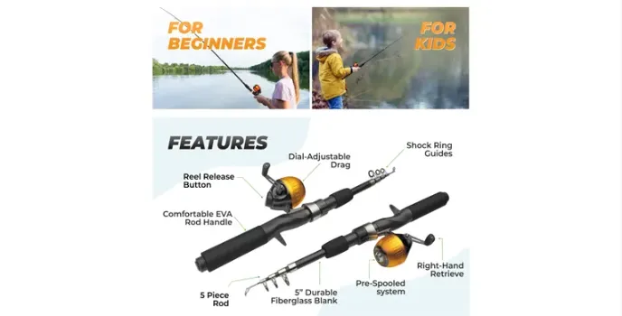 The rod is a 65-inch telescopic fishing rod with a Spin cast reel which can be easily collapsible and can be stored in a carry bag to protect it from any sort of damage. The tackle box is also stocked with gear, a minnow net, and a beginnerβs guide.