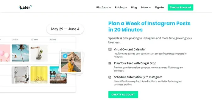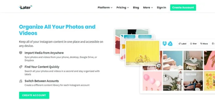 Later is the best social media automation tool to manage your Instagram. It provides you an option to sync in all your pictures, videos from your mobile phone, desktop, and Dropbox. You can use this platform to share your original pictures with your followers.