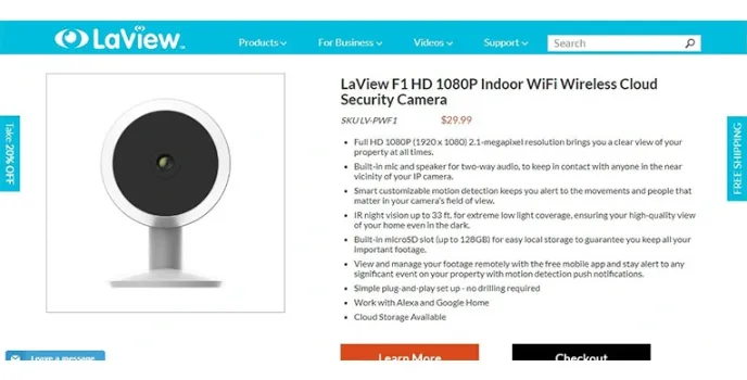 LaView has a built-in system which provides a power supply over ethernet which increases the clearity in recording and speed to upload it over the cloud. It is a Home security system which has a built-in mic system which records all the necessary noises by canceling the other random noises.