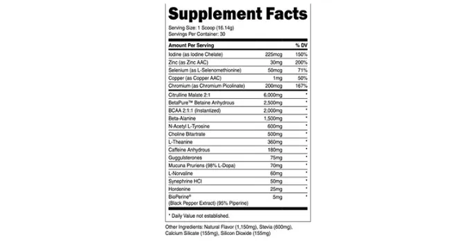 To name a few ingredients - Citrulline malate, beta-alanine, betaine, synephrine, and branched-chain amino acids are all blended at clinically effective dosages and have zero colored dyes unnecessary fillers, or harmful additives.
