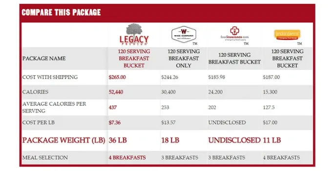 Legacy emergency food supply kit provides you with 120 hot and ready breakfast meals which is more than the Survival frog and the Wise food storage. These freeze-dried recipes last up to twenty-five years with four different breakfast options and indulge in satisfying the breakfast needs in an emergency. And these heavy-duty buckets can be opened and resealed without affecting the shelf life.
