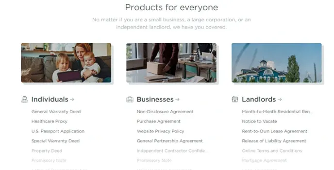 Primarily, the website offers services to three types of ventures. These are on an individual level, business level, and for landlords. The requirement and necessary documents for each of these varies. The website offers documentation for last will, healthcare, marriage and divorce, and some similar work. On the other hand, the business part gives you options between LLC, S corp, C corp, and Non-profit. Depending on your requirement, you can select any of these. The fee for applying for any of these is pretty affordable. Even individual legal online trademark service documents come at a convenient rate in comparison with some similar services.