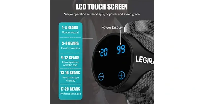 Legiral - A cordless massage gun with adjustable speed and vibration levels.
