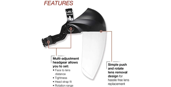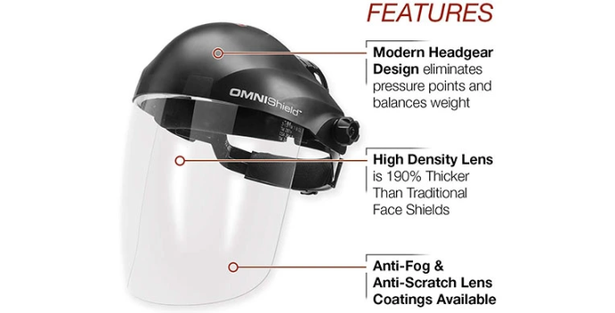Anti-scratch coating improves abrasion resistance and durability. This feature is similar to the one present in the Sellstrom face shield. The unique molded shell and lens provides protection to head and neck and deflects impacts. It also improves clearance with power tools. The headband absorbs sweat and is cushioned front and back. It makes you feel comfortable by using it every day. The multi-axis headgear allows you to easily adjust face to lens distance, tightness / looseness, top of head fit, rotation force and rotation range. These multiple adjustments provide optimal fit and function.This type of adjustment is seen on the Honeywell face shield. The Omni shield headpiece is compatible with all 4 styles of replacement lenses and two styles of hard hat adapters. This versatile design can be used for a wide range of applications and environments. It gives you good protection and you no need to wear glasses for secondary protection. It can be used with a respirator. You can flip the shield based on your convenience.