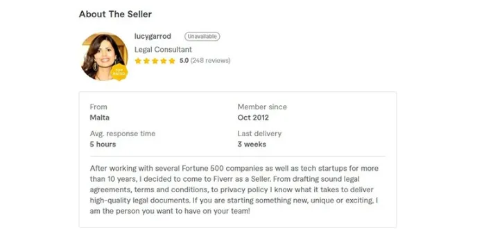 Lucy Garrod is a legal consultant who has in-depth writing experience, and however, if you are a startup and prominently requests a legal writer cum consultant specialized for startups. You can refer to Sunshine, the startup specialist in the Fiverr arena. Lawyer 4u can also be touted as an alternative for legal consultancy.
