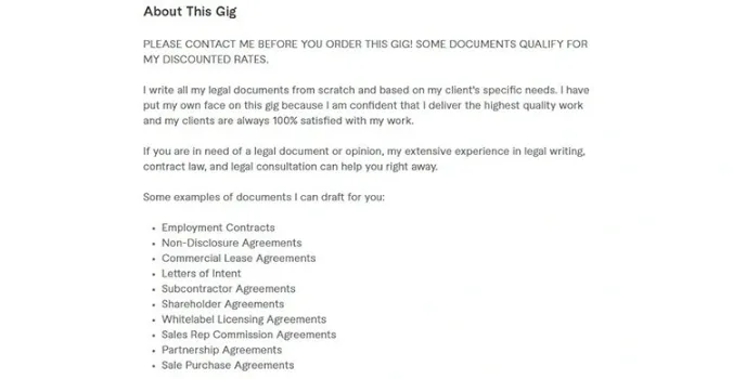 Having worked with fortune 500 companies, she has imbibed thorough professionalism in all her ways. Her expertise in legal writing helps in resolving legal matters. She specializes in subcontractor and stakeholders. Her strengths include commercial lease agreement and partnership along with subcontractor and stakeholders agreement. Are you looking for quality social media services at Fiverr? The website has a pocket-friendly service for all. She has years of experience in legal writing and has a happy and satisfied clientele to her credit. It speaks volumes about her quality of work.