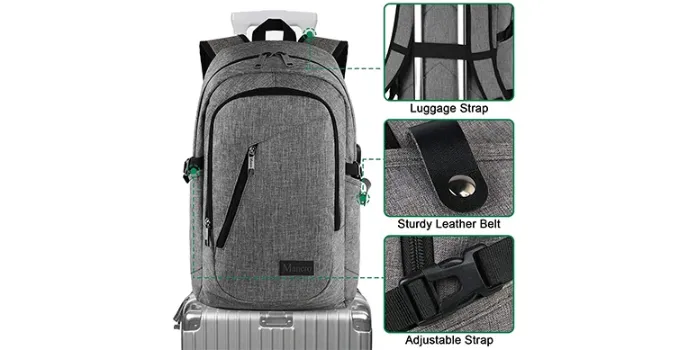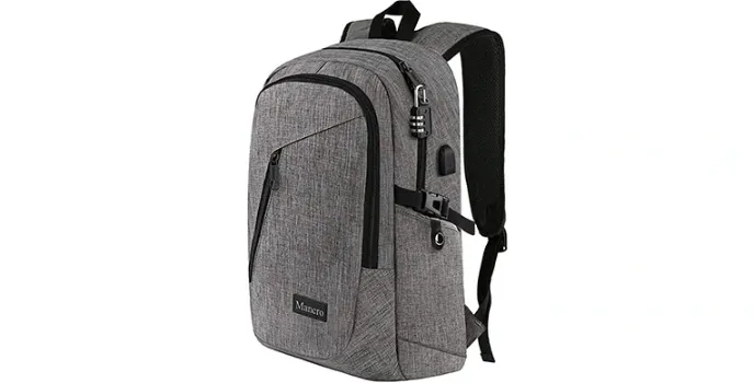 This backpack has a simple design with 12+ side and front pockets with storage space to fit iPad, binders, clothes, books, chargers, and many other essentials. The inside pocket can hold a laptop or a Macbook of size between 14 inches and 16 inches easily. The bag's back design has "S" shaped straps that are padded with cotton and air to relieve stress from the shoulders while carrying. This configuration of the backpack makes it convenient for traveling from one place to another. It has an in-built USB port outside and a charging cable inside to enable the charging of laptops and other devices in the bag. It comes equipped with a lock to make sure the bag is anti-theft to take it to airports and other crowded places.