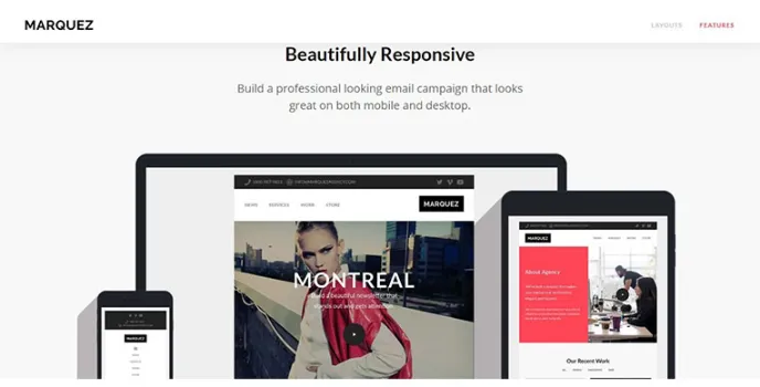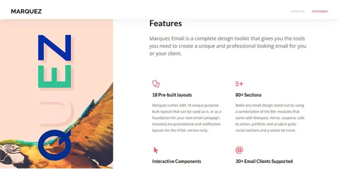 Marquez uses key characteristic features such as online building total response, easily changeable background images, compatibility with more than 30 email clients, supporting retinal images, a grid with 12 columns, column widths, and offsets, personalized mobile stacking, rare and highly interactive components, unique and highly optimizable codes and good documentation.