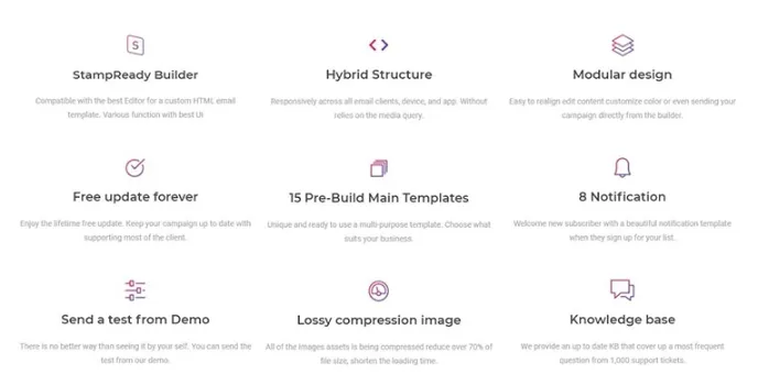 It is easy to replace, delete, and copy the designs with a flexible table structure that supports HTML. There is a compression tool to reduce the size of PNG and JPG files up to 70% effectively. This product offers templates that support 30+ email service providers, including popular ones like MailChimp, iContact, Campaign Monitor, Moosend, etc. The users are allowed to send a test from the demo to preview the features and actions of Matah. They can also enjoy a lifetime of free updates from this software once downloaded like SimpleApp and Marquez.