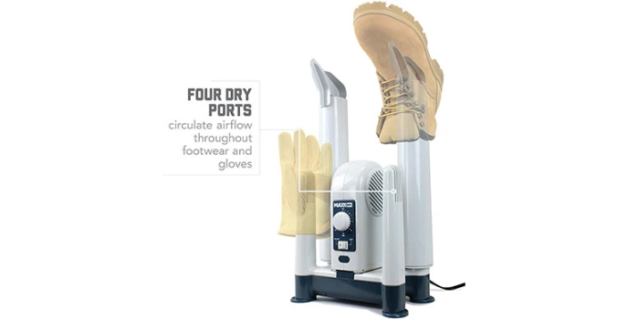 MaxxDry Shoe Dryer can eliminate the growth of bacteria. The forced air boot dryer, shoe dryer, and glove dryer work on up to four garments simultaneously. It heats to 105-degreeF.(40.5-degrees), which is safe for liners, clothes, and boots as well.