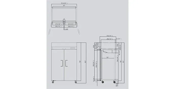 The MCP Distribution 2 door commercial freezer is equipped with energy-star rated ETL, NSF certification, and warranty services, including a 5-year compressor and two-year all additional parts. Therefore, the dimensions of the kitchen freezer are 52" W x 32.2" D x 82.5" H; 47 Cubic Ft Capacity, which accommodates large space.