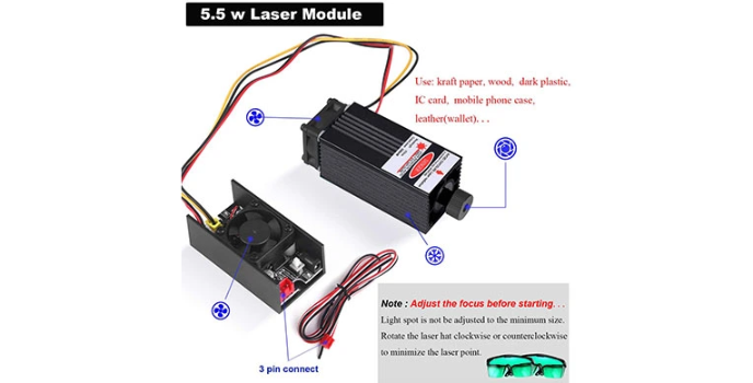 The laser module comes in aluminum alloy with a power of 5.5w wavelength measuring 445 NM with an adaptor wattage of 12V. The product has a working temperature of a lifetime of fewer than 10000 hours. It has a cooling sensation in the earth from the pan and heat sink with the user's engraved with plastic, wood, acrylic, PVC, PCB, aluminum wood, or the like material.