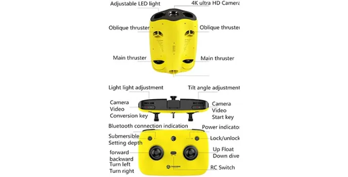 It has a webcast, real-time sharing underwater, wonderful. Support a large screen monitor. It is the best drone for android and iphones. It Dives down, rise-up, hover, tilt, and turn with precision. It is the best lightweight and wireless underwater portable drone that can dive to 330 feet.
