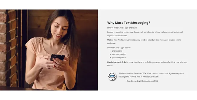 With Mobile Text Alerts, you can reach customers and power your message through an image. You can easily show them your inventory and product on the event flyer.