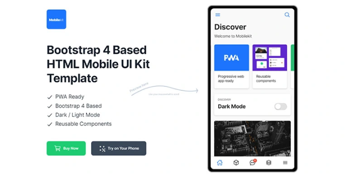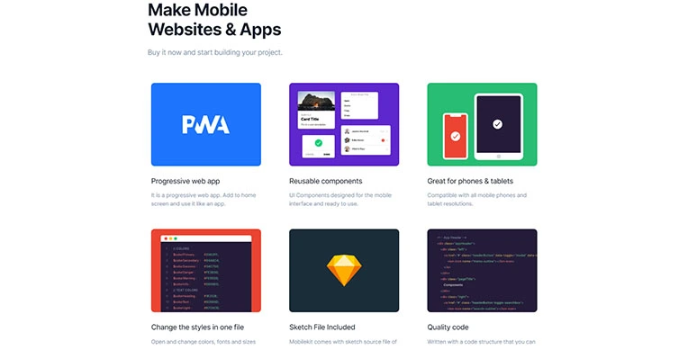 It is with a fast and easy building experience, the Mobile kit. It is compatible with mobile phones and tablet devices. Again it provides organized Sass CSS files for components. Another thing is the clean markup and readable code structure. Above all, it developed with bootstrap four based CSS framework.