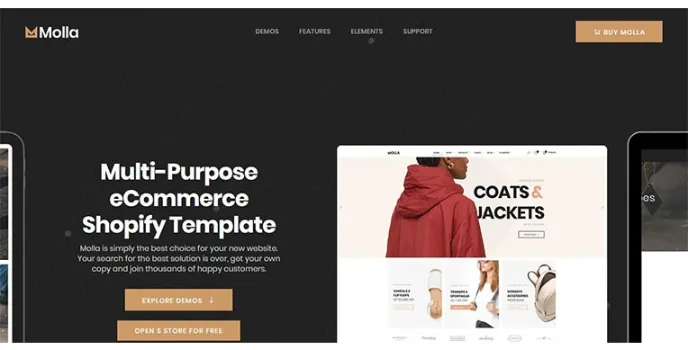 Molla Shopify themes have over ten years of experience with guaranteed UI/UX experience. It also offers an amazing HTML template for eCommerce, specializing in multipurpose markets such as electronics, furniture, shoes, fashion, games, books, etc.