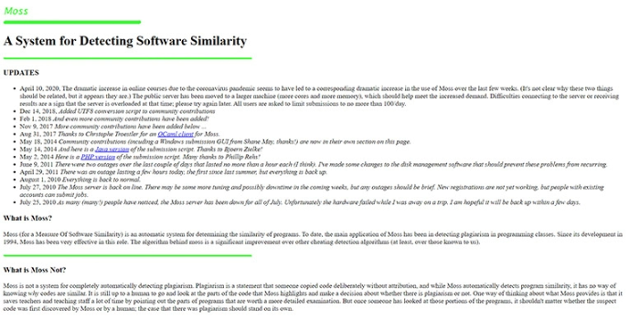 Moss is a free plagiarism detection system for softwares. The main application of it has been in detecting plagiarism in programming classes. It is one of the best online code plagiarism checkers with an easy-to-use interface.