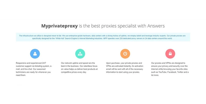 MyPrivateProxy is a Seychelles-based proxies service. It is one of the world's leading private proxy companies and is well-known since it first came on the market in 2011 – it is one of the industry's best suppliers. Interestingly, its vendors were very successful in optimizing search engines (SEO) and social media control. However, you will find that they do not give free trials and you need to pay for using their service.