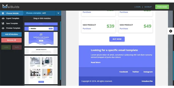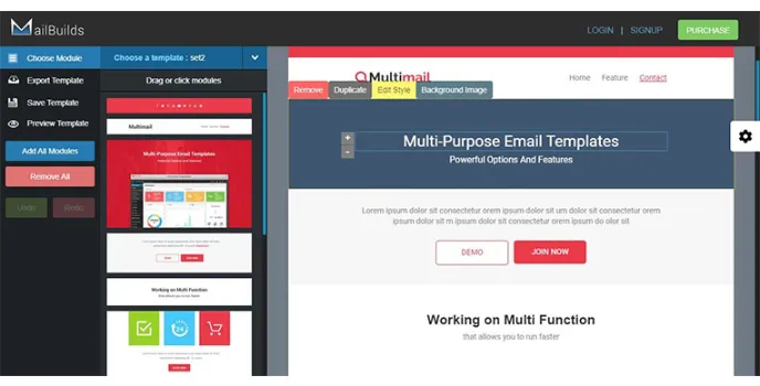Make your emails more appealing with colorful designs and HD graphics by choosing a responsive email template builder like MultiMail. It is reviewed as an online builder with the best-selling email templates of all time. Most of the designs, logos, and other graphics are of high quality to add essence too serious business emails. It has over 17+ templates and 217+ modules to ensure the users never run out of creative ideas to build multiple email designs.