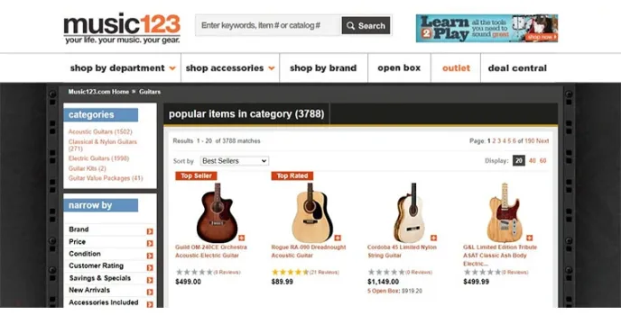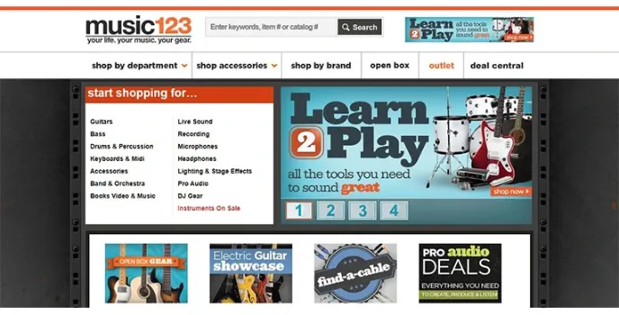Musician's Friend is an online store to buy musical instruments that specialize in recording and studio music equipment. For the most part, its highly centered collection revolves around guitars. Music 123 boasts of some of the best guitars available across the country. Having ties with some top brands, get the desired guitar at a reasonable rate.