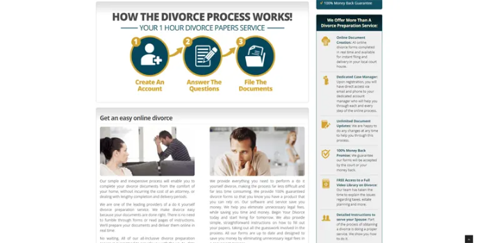 Live Chat support is provided by this divorce document preparation service provider during business hours. File an annulment or separation. File a divorce in all 50 states, including Canada. 100% Court acceptance and guaranteed money back. Dedicated case manager via email and phone. Unlimited document updates.