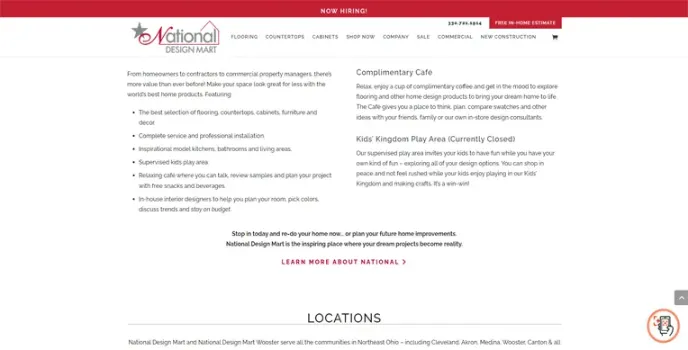The National Design Mart is a wholesale flooring shop that manufactures various home flooring options. The store is locally owned by the King family and features carpet, hard surface flooring, artificial countertops, and cabinets. They offer various designs that inspire buyers to buy their flooring items.