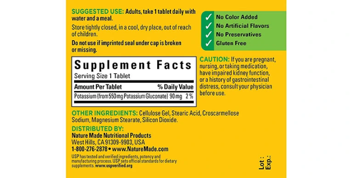 Here is information about one of the viral Nature made potassium gluconate tablets. There are other varieties as well. For instance, if you are seeking a pill to control weight loss, you must prefer NuturalSlim. If you want to consume a tablet to improve blood pressure, then choose Nutricost.