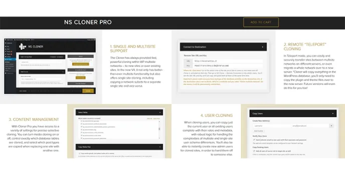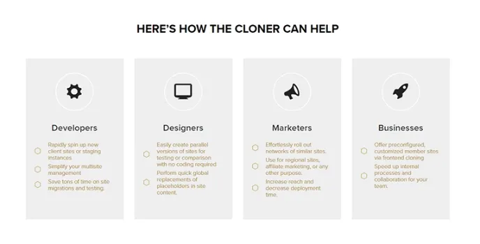 - Powerful single site cloning for new and existing sites