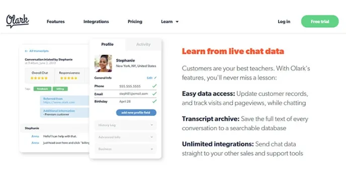 It is a significant advantage to the users that Olark can research all the live chat transcripts. Doing that can extract data on the latest product search, log history, and customer insights. In addition, this software solution also helps build supreme quality Facebook chatbots that enhance marketing strategies by promoting services and brands by sending out personalized messages and notifications to the customers.