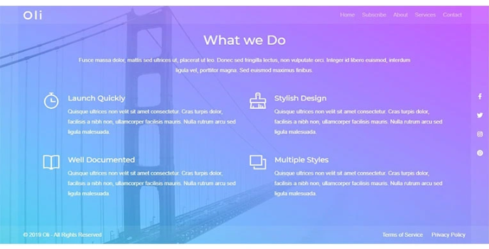 Oli manages both primary and secondary content. The landing page is a multi-purpose template page for all kinds of business websites. It has stylish design website templates. Ajax subscription and contact forms are also available.
